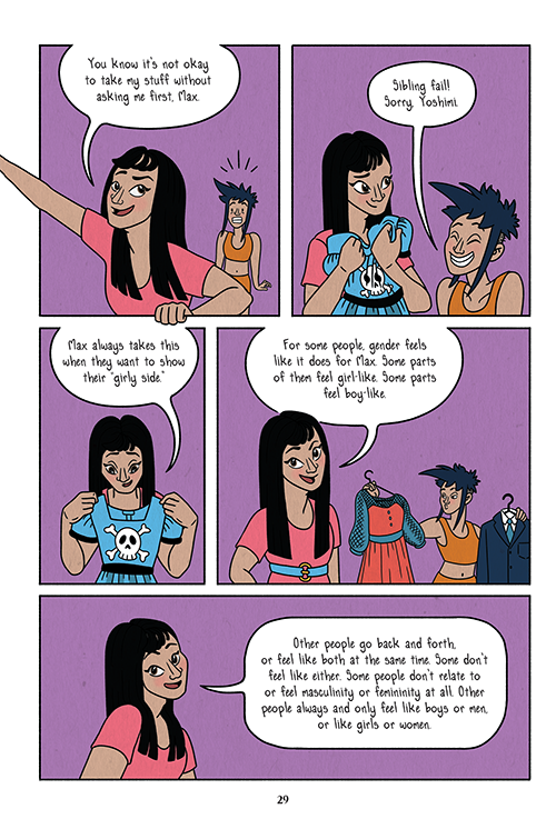 I love the way this section (text and descriptions are at the bottom of the page for those using screen readers) talks about and shows gender identity and expression, and I particularly love the relationship between Max and Yoshimi: you can tell how Max’s sister probably had and has a whole lot to do with how confident and safe Max feels in their identity, and how Yoshimi’s big sister energy is very clearly appreciated and felt by all the friends (a thing we suspect some of the younger siblings of Scarleteen readers may also experience).