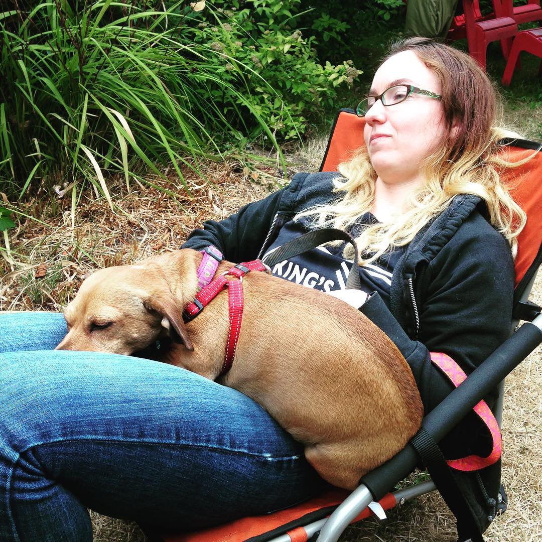 Trouble was not the only dog at camp. Moo, Trouble’s larger roommate, was also present. I like Moo, and Moo likes me. She is an excellent dog to scritch while you’re brainstorming article ideas. But for Trouble, the idea that I might be petting a dog who wasn’t him was unbearable. It was THE WORST THING THAT EVER HAPPENED. He took to pushing Moo out of the way to get my attention (which is no small feat, since she’s three times his size).